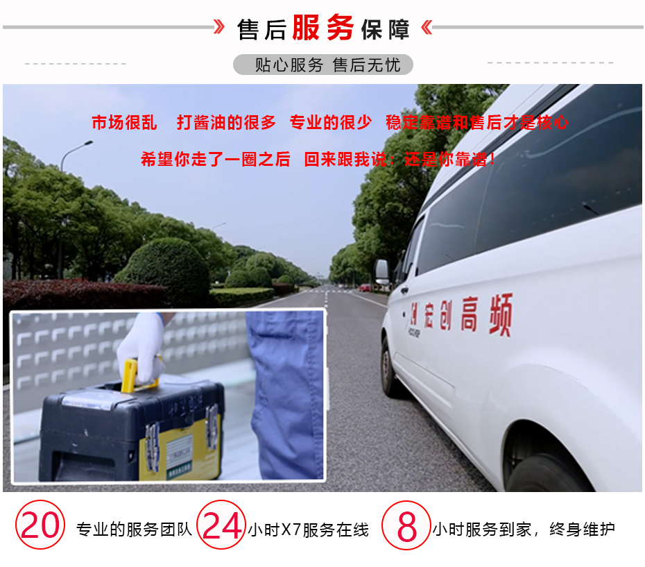 协同服务 service 宏创高频承诺一年质保、终身维保。设立24小时在线客服,响应客户紧急需求,保障客户利益,可提供24小时内上门支持。 宏创高频承诺一年质保、终身维保。设立24小时在线客服,响应客户紧急需求,保障客户利益,技术在线解答疑惑,半小时内给予解决方案,可提供24小时内上门支持。