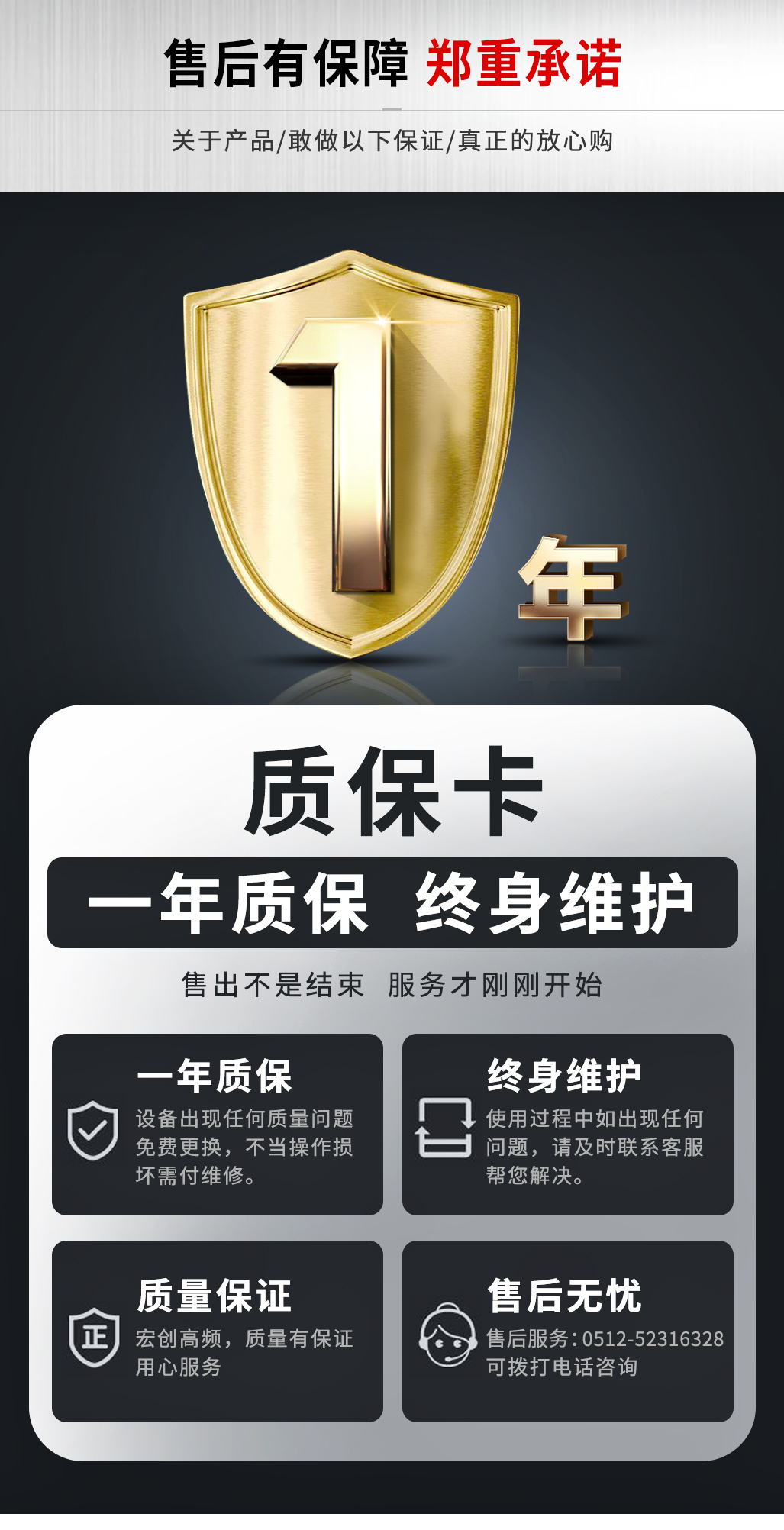 宏创高频承诺一年质保、终身维保。设立24小时在线客服,响应客户紧急需求,保障客户利益,技术在线解答疑惑,半小时内给予解决方案,可提供24小时内上门支持。