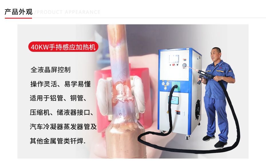 手持式数字感应加热设备具有“移动方便”、“可控性强”、“安静舒适”、“操作精确”和“低成本”等优点,被广泛应用于制冷暖通、家用电器、汽车制造和医疗器械等行业。特别适用于:空调制冷阀件、冰箱冰柜管路件、太阳能配件、压缩机部件、洗衣机(管与管的连接、管与外壳的连接、管与阀门的连接)、汽车蒸发器和压缩机的连接和电动机的短路环等钎焊工艺。